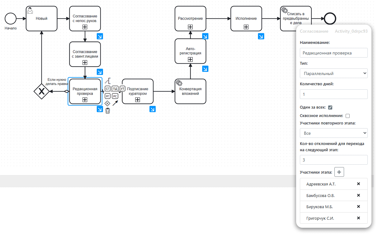 Настройка группового согласования и лимита отклонений в BPMN-редакторе