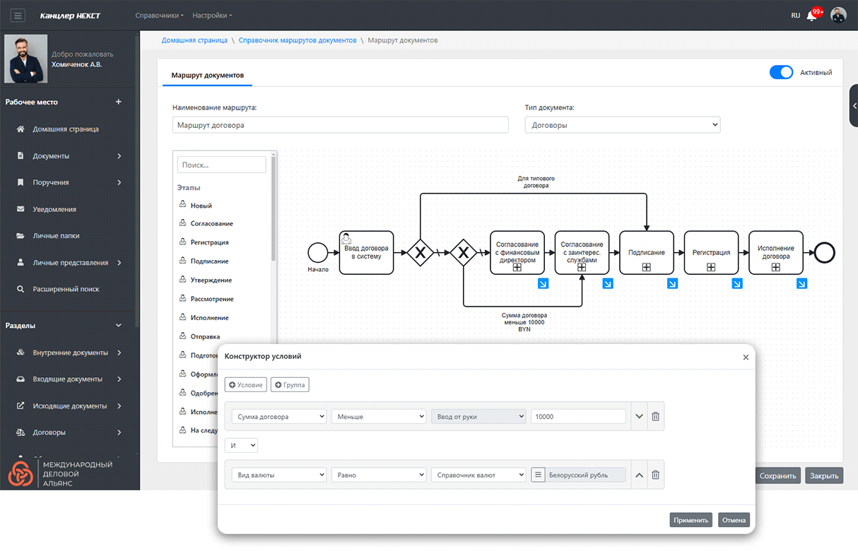Умная маршрутизация: документ автоматически идет по нужному маршруту в зависимости от суммы договора