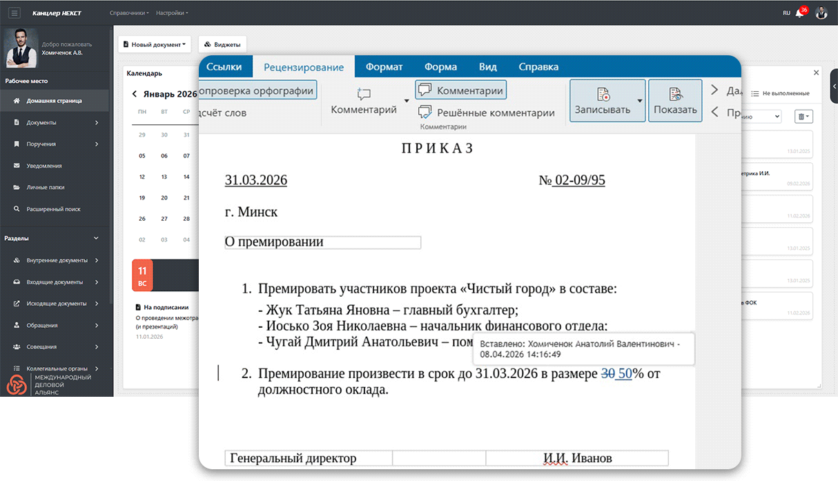 В систему встроен браузерный редактор, с которым можно забыть о пересылке файлов. В «Канцлер НЕКСТ» он похож на привычный Google Docs, но развернут в закрытом контуре, а не в облаке, и интегрирован с процессами СЭД. Больше не нужно скачивать документ на компьютер, вносить правки в локальном редакторе и загружать обратно версию «final_v2_правки_юриста».